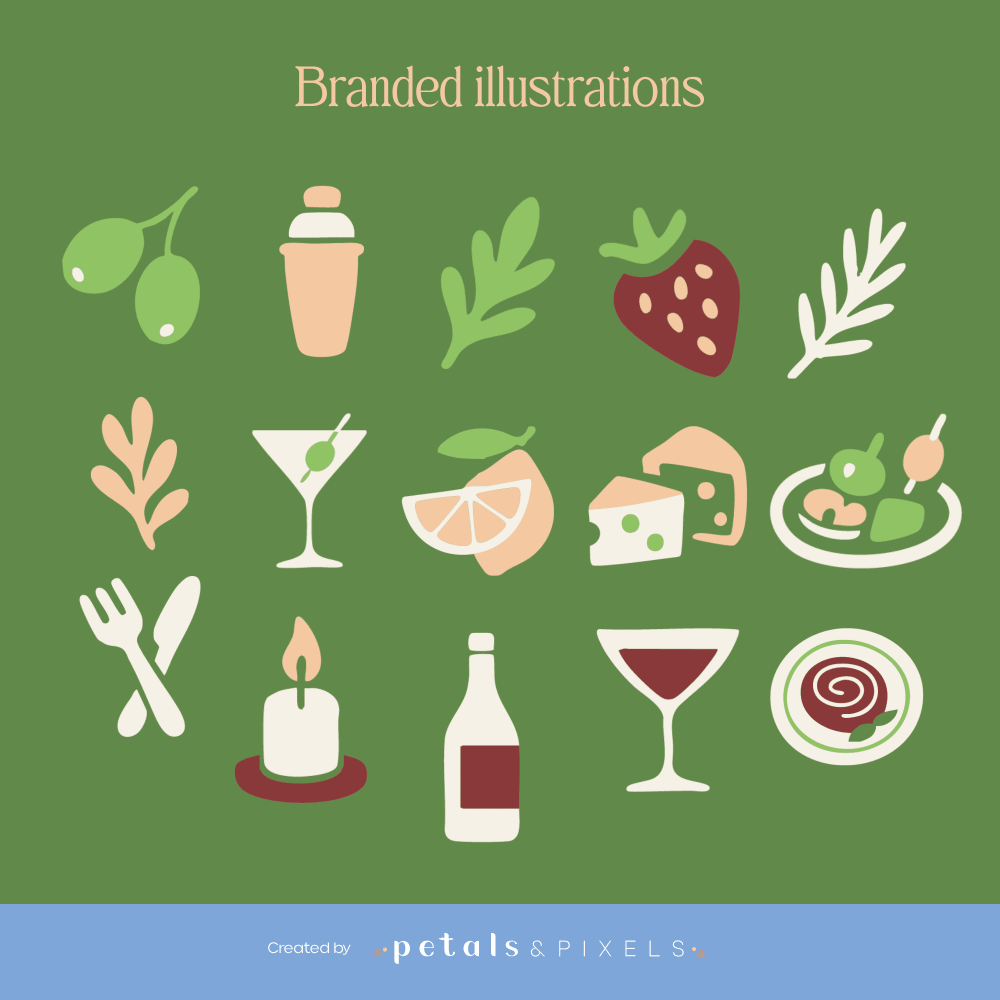 ✔ Uniek icoon – zoals een cocktailglas, olijfprikker of wijnvlek-illustratie