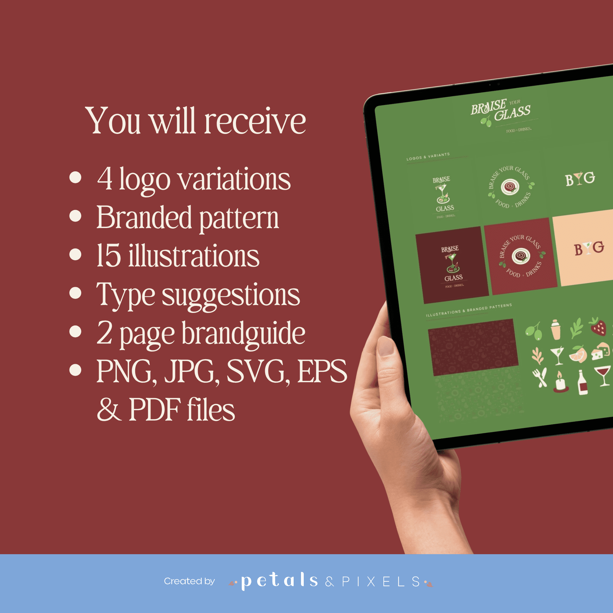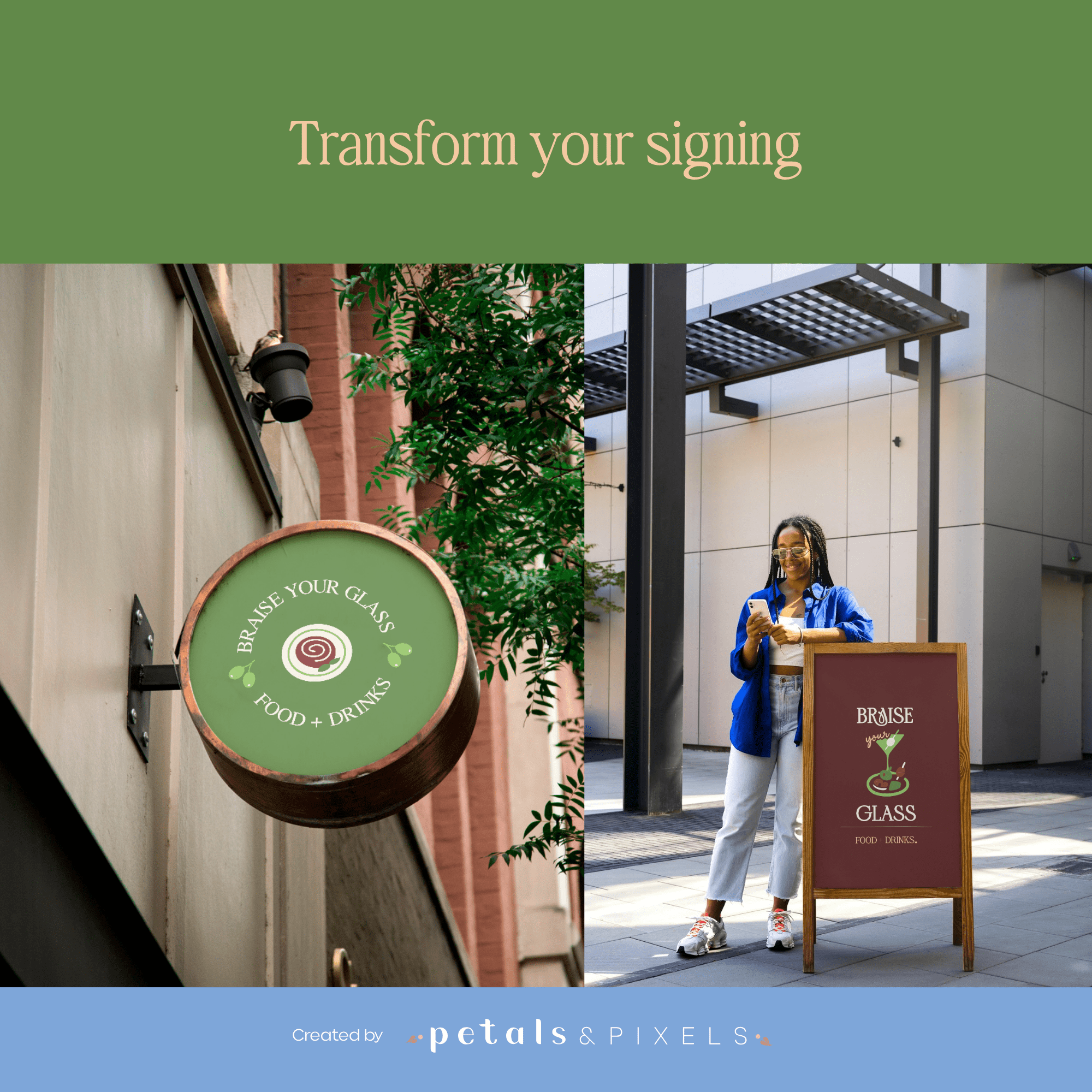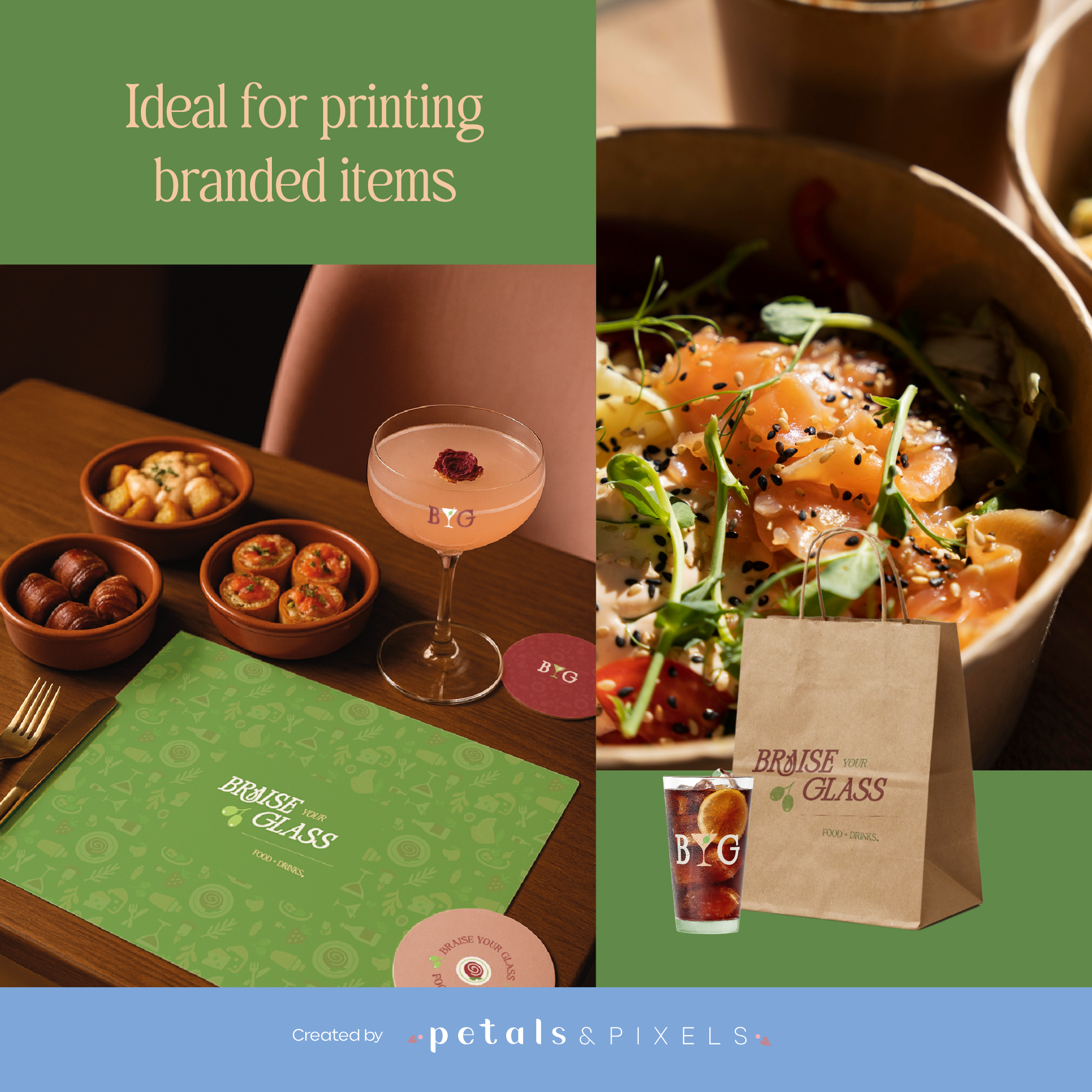 Of je nu een elegante cocktailbar runt, tapas serveert in een bruisend bistroconcept, of je eigen cateringservice opzet: met het Braise Your Glass brandingpakket geef je je merk een onweerstaanbare visuele identiteit.